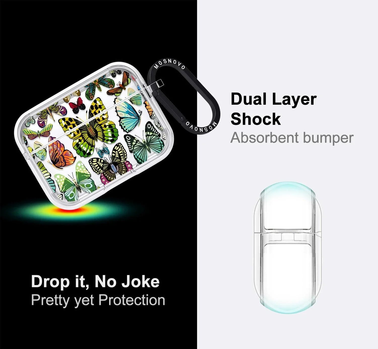 Co-molded construction with a protective frame protects against impacts and drops and fits perfectly with AirPod Pro